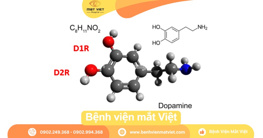 DA kích hoạt thụ thể β, truyền tín hiệu thị giác và sự phát triển cận thị, có thể là thông qua kích hoạt thụ thể của nó. DA liên kết với protein G có hầu hết các tế bào thần kinh trong võng mạc, bao gồm các thụ thể D1R, D2R, D4R và D5R. Thụ thể DR2 quan trọng hơn trong việc trung gian tiến triển cận thị so với thụ thể DR1(kích hoạt thụ thể DR2 có thể dẫn đến cận thị, thụ thể DR1 có thể gây viễn thị).