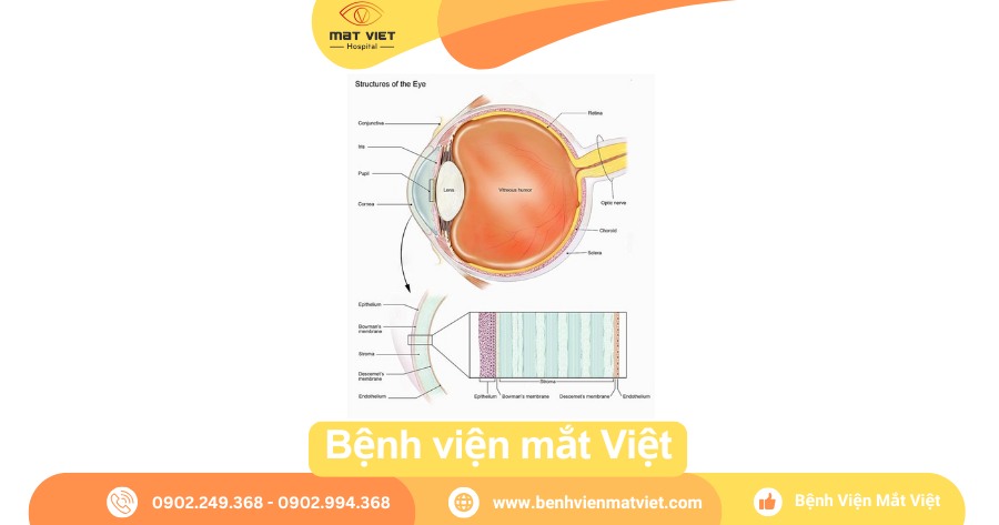 Giác mạc là lớp mô trong suốt, hình vòm nằm ở phần trước của nhãn cầu, giống như “tấm kính trong” che phủ con ngươi và mống mắt. Đây là một cấu trúc không có mạch máu, rất nhạy cảm, giữ vai trò quan trọng như một thấu kính hội tụ của mắt. Cấu tạo gồm 5 lớp, từ ngoài vào trong theo thứ tự: biểu mô, màng Bowman, nhu mô, màng Descemet, nội mô.